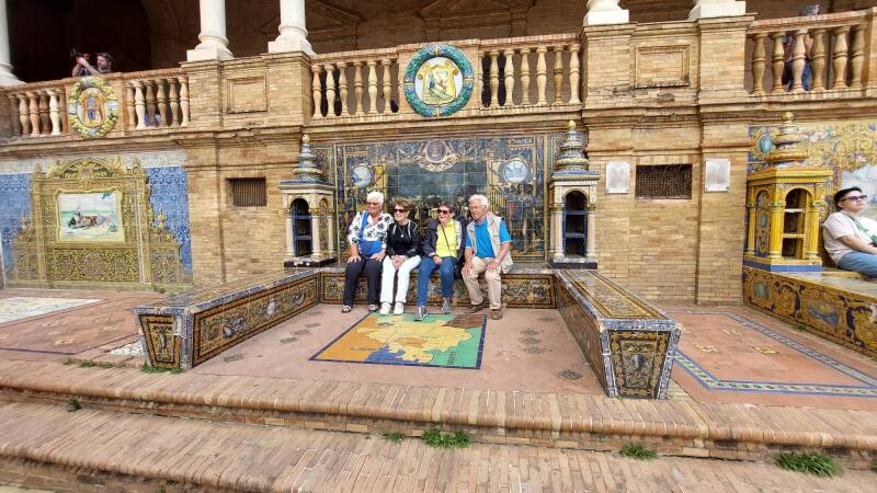 Heute steht das nächste Highlight in Sevilla an. Wir fahren mit dem Bus wieder bis Prada und gehen dann durch den Park zum Plaza Espana. Diese Anlage wurde anlässlich der Weltausstellung 1929 errichtet und ist eine wunderschöne Kombination aus Platz, Park und Gebäude. Die Gebäude bestechen durch eine fantastische Klinkertechnik in Kombination mit glasierten Keramikelementen. Für sämtliche Provinzen gibt ei einen eigenen Bereich im Halbrund. Vor dem Gebäude befindet sich ein Wasserlauf, der mit kunstvollen 4 Brücken überquert ist. Alles ist absolut sehenswert. Der zugehörige große Park rundet die gesamte Situation ab und besticht mit super hohen Eukalyptusbäumen und vielen anderen Bäumen und Gewächsen. Nach einer gemütlichen Kaffeerunde am Plaza America laufen wir weiter in Richtung Guadalquvir und als wir über die Brücke gehen sehen wir eine der größten Privatjachten der Weld am Kai liegen, die Lady Moura, gehört einem mexikanischen Geschäftsmann und wird auf 200 Mio US Dollar Kosten geschätzt. Wir gehen dann noch weiter bis zum Gelände der Feria, wobei das Fest erst ab 18:00 Uhr eröffnet wird. Solange wollen wir nicht warten und fahren dann mit dem Bus und voller tollen Eindrücken wieder zurück zu unseren Wohnmobilen.