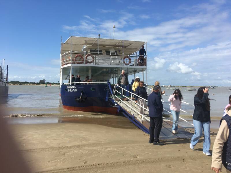 Heute steht ein besonderes Highlight auf dem Programm. Wir wollen den Nationalpark Donana besuchen. Dazu überquert man mit dem Schiff den Mündungsbereich des Guadalquivirs und steigt dann in einen Allrad-Bus um und wird durch den Nationalpark gefahren. Wir fahren zu den Wanderdünen und auch zu den Plätzen wo wir Hirsche, Damwild, Wildsauen, Flamingos usw. sehen können. Zuvor müssen wir mit dem Taxi von unserm Campingplatz nach Sanlucar de Barramede fahren.